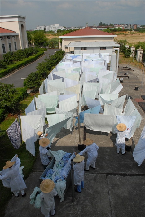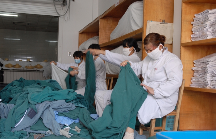 ????到時恰巧遇到八名戴著草帽、口罩,裹著毛巾,穿著白大褂的洗滌女工們將一批床單送到曬衣場晾曬。烈日藍天下,各色床單隨著微風(fēng)輕輕擺動,別有一番風(fēng)味。洗衣間負(fù)責(zé)人傅愛軍介紹,現(xiàn)在每天都有近三千件衣物需要清洗,包括床單、被套、各類手術(shù)布、白大褂等,“每天8點、9點、12點和下午2點,總院會有專車把待洗衣物送過來,3個小時后又要把它們送回去?!耙驗槭中g(shù)多,手術(shù)布使用量也大,所以手術(shù)布清洗量是很大的?!?BR>????在洗衣房里,?四個2米左右高的專用洗衣機正在運轉(zhuǎn),一直發(fā)出“哄哄哄”的聲響,并散發(fā)著懾人的熱氣。洗滌工姜阿姨向記者介紹了洗滌大致的流程:首先將待洗衣物進行開始分類,根據(jù)種類將它們分別浸泡在不同的消毒水池中,其中兩個水池浸泡普通床單,一個浸泡白大褂,一個浸泡帶血漬的衣物,而其它來自傳染科的衣物床單被裝在一個黑色密封塑料袋中,進行特殊的消毒處理?!敖葜笪覀儠鶕?jù)分類把衣物放進不同洗衣機里,進行90℃的高溫消毒洗滌,這個過程需要1個小時20分鐘。然后小件的進行烘干,大件的則進行晾曬,最后將干凈的衣物進行折疊?!苯⒁讨钢慌哉R的衣物說,“即便是一條小小的手術(shù)布也需要在我們這里待上3個小時。整個洗滌的過程,我們都要穿著白大褂戴著口罩。”記者發(fā)現(xiàn)姜阿姨的頭發(fā)已經(jīng)滿是汗?jié)n,她笑笑說自己早已經(jīng)習(xí)慣了。
