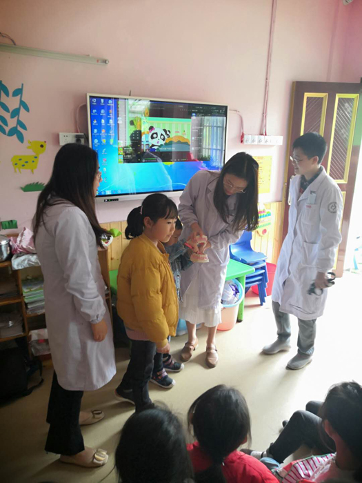 醫(yī)護(hù)人員現(xiàn)場用蛋殼與食醋發(fā)生反應(yīng)的實(shí)驗(yàn)生動(dòng)形象地告訴小朋友們不良飲食習(xí)慣給牙齒帶來的危害,并教會(huì)小朋友正確的刷牙方法。