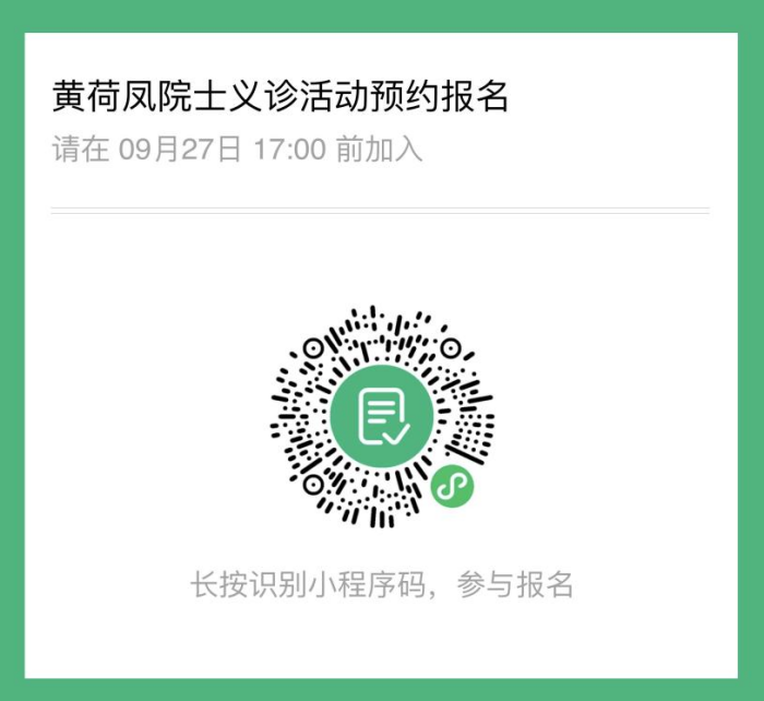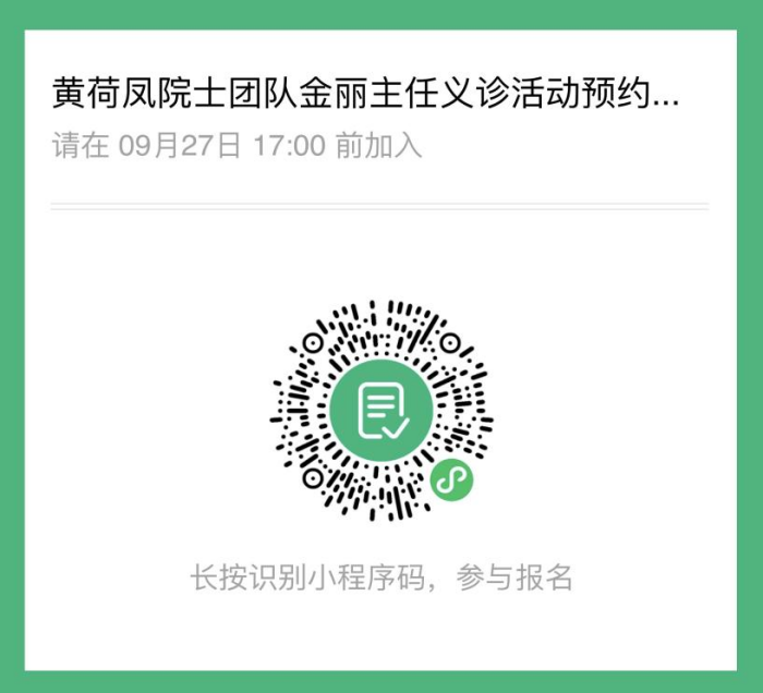 微信掃碼預(yù)約,限號30個,黃荷鳳院士10個號、金麗主任20個號,請掃碼預(yù)約時填寫個人準(zhǔn)確信息,約滿為止。