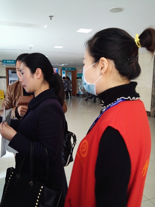 ??? 楊建琴、嚴紅雁、王宇寧、周土蘭、洪波、王蕓、鄭小云、潘燕、曹建峰、何媛、舒莉、管若楠、金佳麗、邱悅波等14人在衢州市人民醫(yī)院做志愿者,主要來自社會志愿者和本院志愿者。 志愿者們主要為患者指路引導,陪伴行動不便、年老體弱患者就診,指導患者自助服務機使用方法,引導患者化驗前取號、打印化驗單,協(xié)助門診大廳工作人員疏導病人。