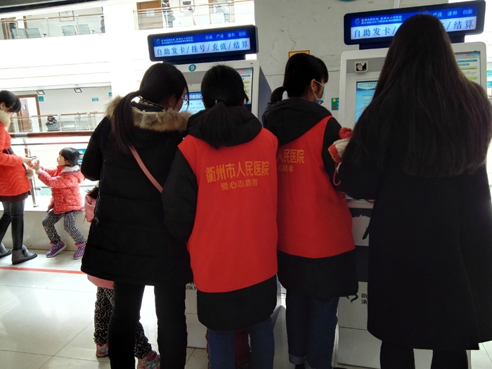 ??? 余慧晨、徐思惠、張莘陟、徐安琪、呂丹、陳玉瑩、徐怡、周孟穎、周慧娟、毛如意、鄭琦慧、葉佳蕓、王喬梅、王宇寧等14人在衢州市人民醫(yī)院做志愿者,主要來(lái)自寒假學(xué)生志愿者。 志愿者們主要為患者指路引導(dǎo),陪伴行動(dòng)不便、年老體弱患者就診,指導(dǎo)患者自助服務(wù)機(jī)使用方法,引導(dǎo)患者化驗(yàn)前取號(hào)、打印化驗(yàn)單,協(xié)助門(mén)診大廳工作人員疏導(dǎo)病人。