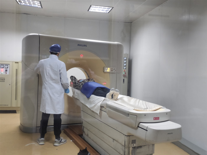 技術(shù)組組長何小龍?jiān)诟∈簠^(qū)機(jī)房為患者做CT檢查