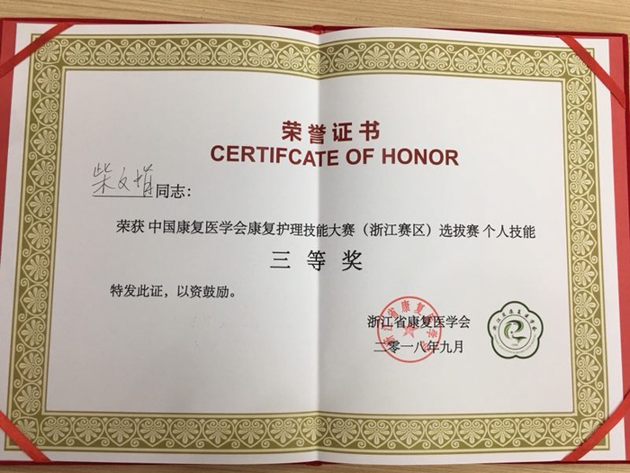 ??? 經(jīng)過激烈角逐,我院柴文娟憑借著扎實(shí)的專科知識(shí)與嫻熟的操作技能,榮獲了中國康復(fù)護(hù)理技能大賽(浙江賽區(qū))選拔賽個(gè)人技能三等獎(jiǎng)。