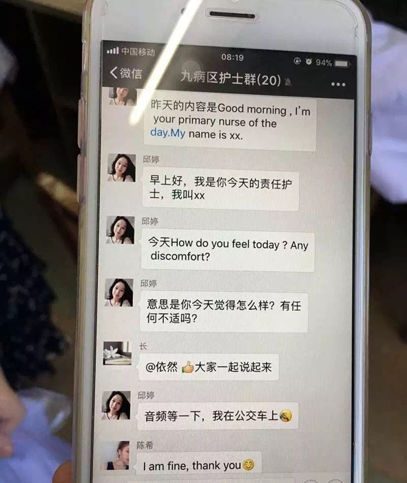 ??? 科室里的其他護士雖然也懂一些英語,但在口語交流上沒那么順暢。因此,邱婷換班休息的時候,為了讓其他護士也能順暢地和小陳交流,她特意在泌尿外科護士的微信群里發(fā)送簡單的英語交流句式,如“How do you feel today?”“Any discomfort?”……疼痛評分、留置針觀察、測量生命體征、排便情況等一些日常用語,被邱婷精心整理并發(fā)送到群里,以便讓同事們“現(xiàn)學(xué)現(xiàn)用”。