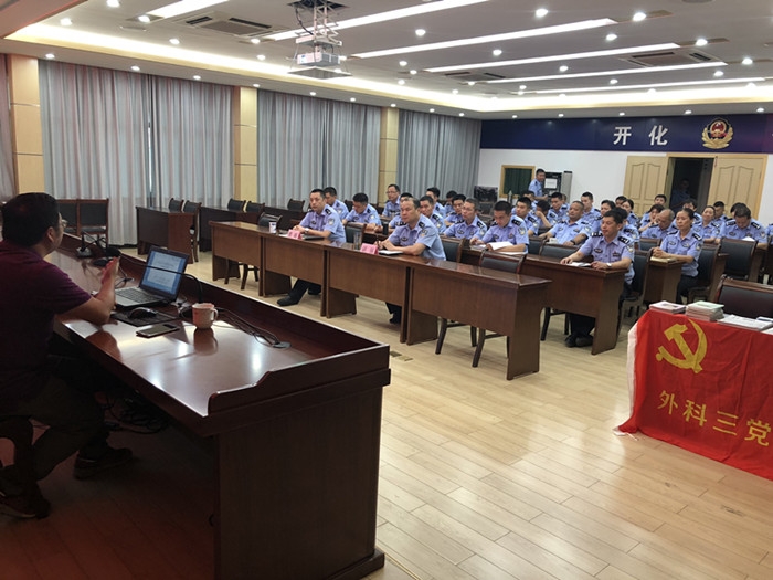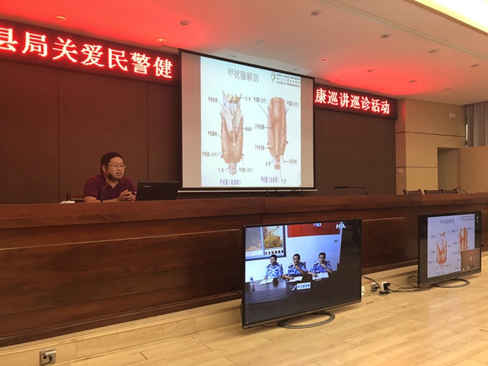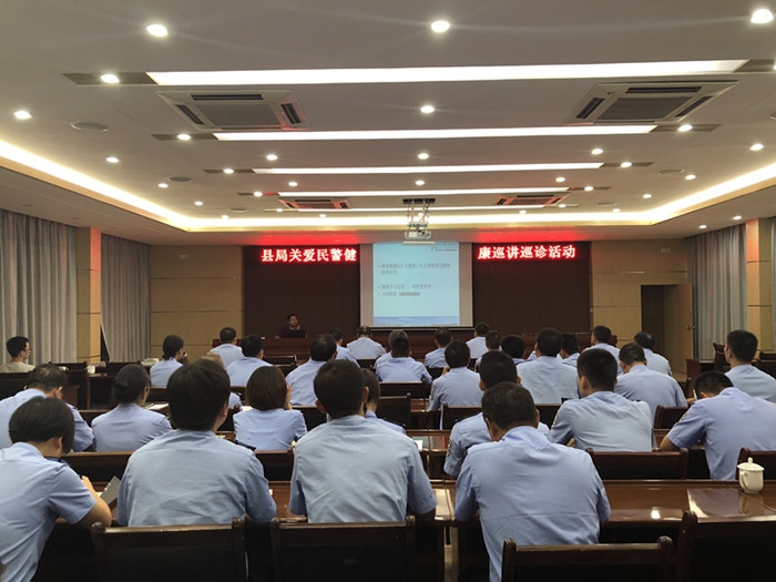 ????開化公安局的干部民警認真聆聽講座,同時開通電視視頻,同步直播給基層民警。民警們對照科普講座,結合體檢報告進行自查。