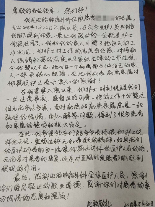 ??? 6月7日上午,我院肛腸外科護(hù)士長(zhǎng)收到了一位患者家屬親筆書寫的感謝信,表達(dá)對(duì)仰筱旺護(hù)士的感激之情,并為肛腸外科醫(yī)護(hù)團(tuán)隊(duì)點(diǎn)贊。