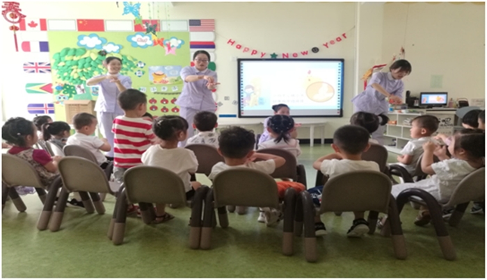 ? ? 為了讓小朋友們更好地認(rèn)識(shí)和學(xué)習(xí)手衛(wèi)生知識(shí),輸液室護(hù)士趙曉華根據(jù)小小班小朋友的特點(diǎn),通過(guò)生動(dòng)形象的卡通圖片讓他們了解手衛(wèi)生知識(shí),并且通過(guò)做示范、學(xué)洗手操等和小朋友們開(kāi)展互動(dòng),讓小朋友知曉手衛(wèi)生的重要性。