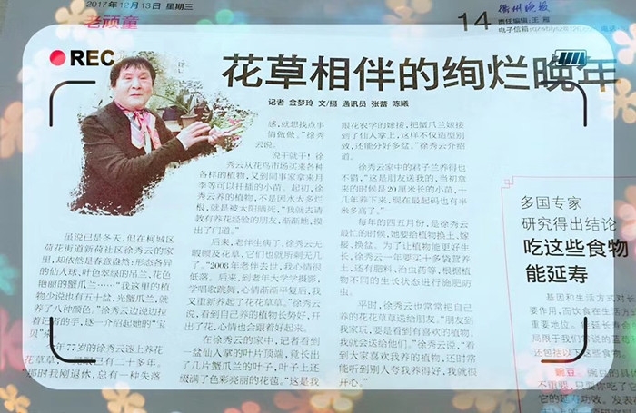 ??? 來(lái)到徐秀云老師家,首先映入眼簾的是令人驚喜的小院子,形態(tài)各異的仙人球、葉色翠綠的吊蘭、花色艷麗的蟹爪蘭……“我這里的植物少說(shuō)也有五十盆,光蟹爪蘭,就養(yǎng)了八種顏色。”徐老師邊說(shuō)邊拉著我們的手,逐一介紹起她的“寶貝”來(lái)。