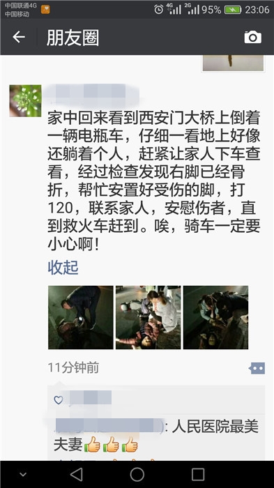??? 12月25日晚上9點(diǎn)多,市區(qū)西安門(mén)大橋上,一名中年男子騎電瓶車(chē)時(shí)不慎摔倒躺在路邊,正好被我院的一對(duì)醫(yī)護(hù)夫妻看到。他們立即上前施救,并幫忙撥打了120,直到120急救車(chē)到來(lái),并交代了病情后,這對(duì)夫妻才悄然離開(kāi)。