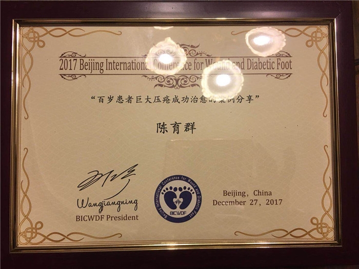 ??? 在認(rèn)真檢查、評估傷口后,陳育群收下了他住院,與外科醫(yī)生一起制定方案,采用新型濕性愈合換藥理念及功能性敷料,為詹師傅治療。奇跡發(fā)生了,一個多月以后,詹師傅痊愈了?,F(xiàn)在,他成了陳育群的“活廣告”,到哪都夸陳育群的技術(shù)好。