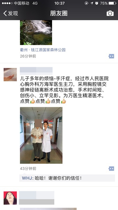 ??? 我院心胸外科萬海軍副主任醫(yī)師僅在患者一側(cè)胸壁切開一個0.5公分左右的小口,在非氣管插管麻醉下行“胸腔鏡雙側(cè)胸交感神經(jīng)切斷術(shù)”,困擾了小王10多年的手汗癥煩惱,竟然十幾分鐘就輕松搞定,效果立竿見影。術(shù)后,小王的手汗癥狀立即消失,雙手轉(zhuǎn)為干燥溫暖狀態(tài),第二天就康復(fù)出院了。