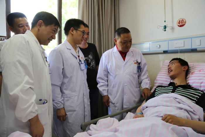 ??? 5月18日下午,衢州市衛(wèi)生計生委黨委委員、副調研員張??ьI由市人民醫(yī)院神經(jīng)外科、康復科及市第三醫(yī)院神經(jīng)內科組成的醫(yī)療專家團隊前往衢江區(qū)中醫(yī)院看望在此進行康復治療的章浩杰同學,市衛(wèi)生計生委黨委委員、市人民醫(yī)院黨委書記徐天才,市衛(wèi)計委醫(yī)政處處長劉文勇陪同前往。