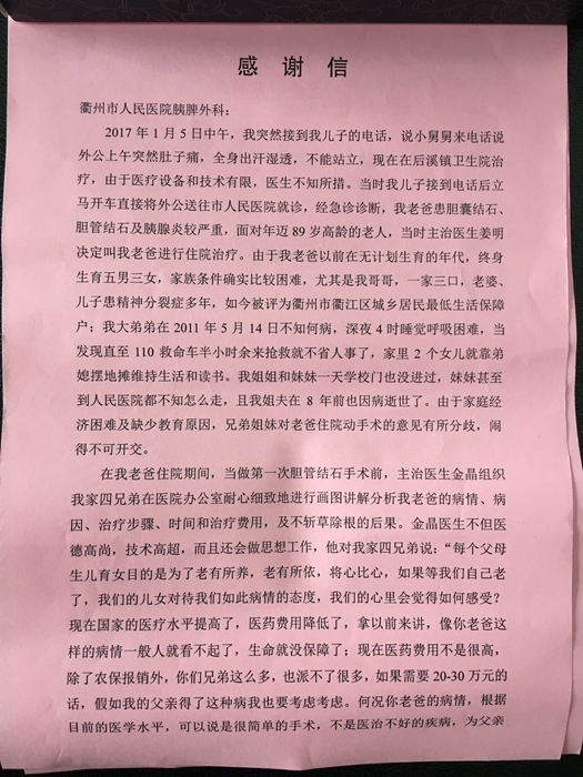 ??? 3月29日一大早,61歲的楊女士專門從柯城區(qū)航埠鎮(zhèn)趕到了我院,將一封紅色的感謝信交到醫(yī)院辦公室的負(fù)責(zé)人手中,“你們醫(yī)院的醫(yī)生不僅醫(yī)術(shù)好,醫(yī)德更好,一定要幫我好好感謝他們?!?/DIV>