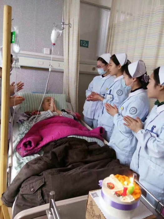 ??? 今天是阿姨的生日,科室里的同事們來到她的床邊,一起祝她生日快樂,也感謝她對我們的信任與理解。雖然她吃不了,但看到她笑容滿面的樣子,我們也很滿足。