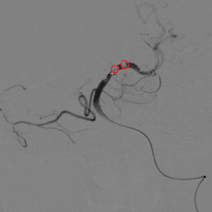 微導(dǎo)管造影顯示血栓(紅圈處)