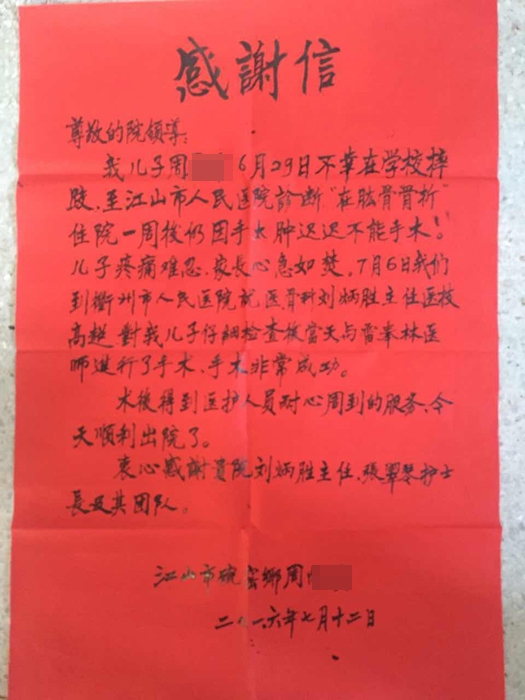 ??? 10歲的小周來(lái)自江山,6月29日,小周在學(xué)校玩耍時(shí)不慎摔跤,結(jié)果導(dǎo)致左肘部腫痛畸形,父母送小周在當(dāng)?shù)蒯t(yī)院檢查后發(fā)現(xiàn)小周“左肱骨髁間骨折”,住院一周后,小周左手肘部腫脹明顯,無(wú)法進(jìn)行手術(shù),家屬十分焦急,7月6日,家屬帶著小周來(lái)到我院骨科就診。在安撫患者家屬不安情緒的同時(shí),醫(yī)生劉炳勝詳細(xì)向患者及家屬講解骨折相關(guān)知識(shí)、手術(shù)方案和術(shù)前、術(shù)后注意事項(xiàng)。入院當(dāng)天立即完善相關(guān)化驗(yàn)檢查,做好術(shù)前準(zhǔn)備,在劉炳勝醫(yī)師和雷奉林醫(yī)生共同配合下,手術(shù)進(jìn)行的非常成功。小周左手肘部疼痛得到控制和緩解,術(shù)后4小時(shí)即指導(dǎo)患者進(jìn)行左手指及腕關(guān)節(jié)伸屈活動(dòng)等相關(guān)肢體功能鍛煉。小周術(shù)后恢復(fù)超出預(yù)計(jì),出院當(dāng)天,父母寫(xiě)下感謝信,感謝劉炳勝醫(yī)生和護(hù)士長(zhǎng)張翠琴及護(hù)理團(tuán)隊(duì)的細(xì)心治療和照顧。