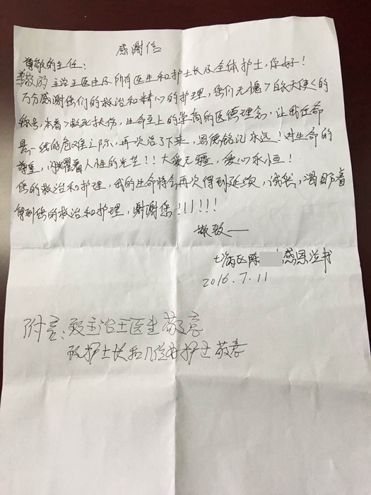 ??? 6月25日晚上,小陳因從高處墜落傷導(dǎo)致頸椎、胸椎、腰椎多處骨折,由下級(jí)醫(yī)院轉(zhuǎn)入我院骨科治療。轉(zhuǎn)入時(shí)患者雙乳頭平面以下感覺(jué)消失,雙下肢全癱,雙小腿及尾骶部多處二期壓瘡帶入。入院后雙下肢血管彩超提示:雙側(cè)股淺動(dòng)脈、腘動(dòng)脈微小斑塊形成,左側(cè)股總靜脈、股深靜脈、股淺靜脈、腘靜脈、脛后靜脈血栓形成。請(qǐng)血管外科、ICU會(huì)診后當(dāng)晚,小陳立即在局麻下行經(jīng)皮靜脈內(nèi)濾網(wǎng)置入術(shù),及時(shí)有效避免了深靜脈血栓的發(fā)生。在醫(yī)護(hù)人員精心治療下,小陳病情得到控制。因?yàn)樾£愂峭獾厝耍彝デ闆r特殊,家屬不能及時(shí)在院陪護(hù),護(hù)士們平日給予治療的同時(shí),還給予細(xì)心的生活護(hù)理,小陳雙小腿及尾骶部壓瘡明顯好轉(zhuǎn)。因疾病帶給他很大的心理負(fù)擔(dān),讓他失去了對(duì)生活的信心,產(chǎn)生了沮喪、不安、消極的情緒,護(hù)士們及時(shí)給予小陳心理護(hù)理,關(guān)心和安慰患者,用自己的愛(ài)心和細(xì)心感動(dòng)著小陳。因小陳雙乳頭平面以下全部癱瘓,只有雙手可以活動(dòng),所以用雙手寫(xiě)下了這封感謝信。