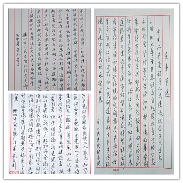 ??? 通過鼓勵創(chuàng)意書寫,在組織黨員開展抄寫黨章的同時,再次重溫黨章精髓,使宗旨意識“入手、入腦、入心”,教育引導(dǎo)廣大黨員干部增強黨性意識,真正做到知行合一,形成正能量和凝聚力。