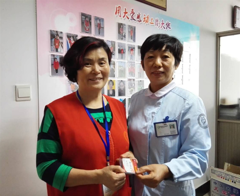 ??? 愛心志愿者服務中心負責人孟慶玲為優(yōu)秀志愿者送上了“優(yōu)先就診卡”
