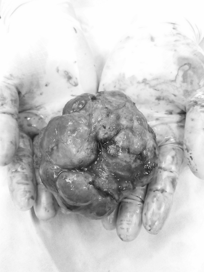 ??? 青春期的少女乳房有一個巨大腫塊,需要手術治療。單純切除乳房腫塊并不難,但如何選擇手術切口,讓疤痕隱蔽,又盡可能減少乳管的損傷,需要費一番周折。我安排女孩當日住院,完善術前檢查,第二天下午手術。術中我選擇盡可能小的切口,并設計在乳腺的下皺折線上,同時采用精細的皮內縫合,這樣切口愈合后會形成一條白線,避免疤痕偽足,也比較隱蔽。然后我從乳腺的外緣去分離腫塊,避免了乳暈區(qū)感覺神經的損傷,也保護了乳頭下方的導管。最后采用像胎兒分娩一樣的方法從4cm的切口中拖出了腫塊,腫瘤連同包膜被完整切除。20分鐘后冰凍病理檢查報告是良性的,與術前判斷一致。2天后,女孩順利出院,無需拆線。