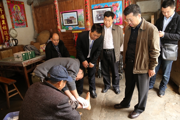 ??? 隨后,劉丙瑞一行帶領(lǐng)萬少華總隊隊長、我院普外科醫(yī)生金晶等醫(yī)護人員來到柯城九華鄉(xiāng)塢口村看望“爛腳病人”魏洪福老人。據(jù)悉,老人曾于2014年9月2日去北京解放軍307醫(yī)院治療(手術(shù)植皮),住院110天,不能完全愈合而出院。專家此次前來,特地了解病人的恢復(fù)情況并作換藥指導(dǎo),在現(xiàn)場,金晶重新將魏洪福的傷口進行了清理、治療、包扎。專家們的認真和親切,讓老人感動不已。