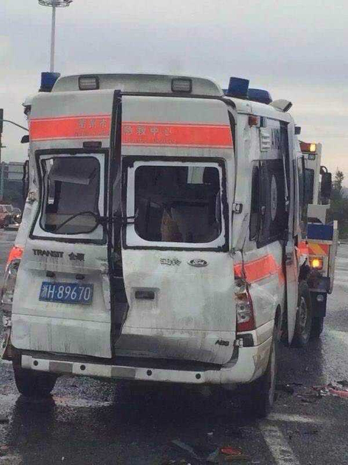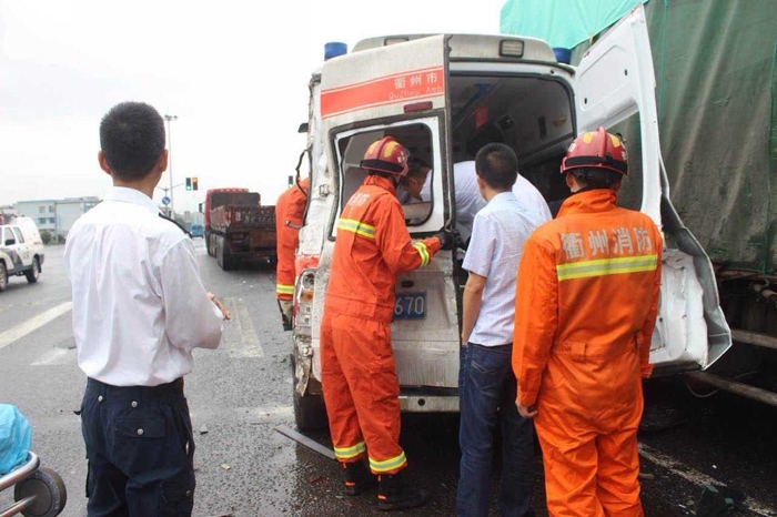 ??? 當日下午,衢州市人民醫(yī)院急診科接到120指揮中心出診任務,回醫(yī)院途中,當急救車行駛至320國道沈家海力集團附近紅綠燈路口,等待紅燈時,一輛半掛車突然從急救車的左側面追尾,巨大的沖擊力導致急救車產(chǎn)生劇烈的搖晃,險些側翻,急救車被??吭谟覀让娴拇筘涇図斪?,受到兩次猛烈的撞擊后,120急救車車身被嚴重擠壓變形,而半掛車仍繼續(xù)往前疾馳了十幾米。當時急救車上有出診醫(yī)生劉龍群、駕駛員汪勝、患者以及患者家屬四人。