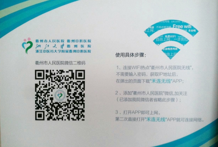 在 WiFi無線網(wǎng)絡(luò)服務(wù)下,患者及家屬可通過智能手機搜索無線局域網(wǎng)“衢州人醫(yī)免費無線”連接之后,打開瀏覽器下載“禾連無線”App,添加衢州市人民醫(yī)院微信公眾號并關(guān)注,即可進行高速上網(wǎng)。wifi使用專用網(wǎng)絡(luò),IP地址清晰,網(wǎng)絡(luò)安全有保障,能提供更好地上網(wǎng)體驗,營造了利于減壓的候診環(huán)境,有效緩解了患者及家屬等待的焦躁情緒。