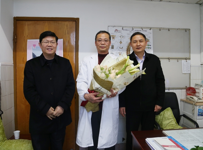 ??? 李鋒向黃強(qiáng)送上了一束精美的鮮花,并致以了親切的問候和新春的祝福。他詳細(xì)了解了黃強(qiáng)的工作、生活情況及未來對神經(jīng)外科建設(shè)發(fā)展的愿景,并鼓勵(lì)黃主任在工作崗位上繼續(xù)發(fā)揮特長和學(xué)術(shù)帶頭作用。