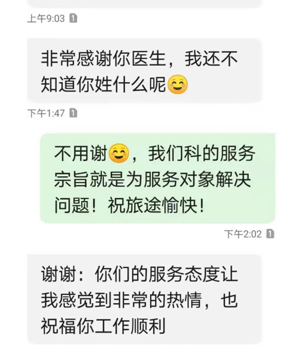 “為你們的高效點贊!本來還擔(dān)心,這么短的時間能不能完成核酸檢測并出具英文版檢測報告單,沒想到在當(dāng)天中午就拿到了結(jié)果?!绷闻勘晃以簷z驗科的高效率和敬業(yè)精神感動,并給檢驗科祝進主任發(fā)來感謝短信。