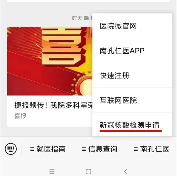 1、關(guān)注我院微信公眾號,預(yù)約新冠核酸檢測,并通過手機預(yù)約繳費。