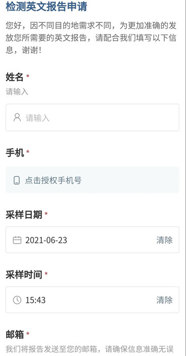 2、采樣結(jié)束后掃描采集點二維碼,申請英文版報告單。