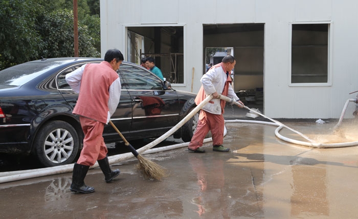 ??? 醫(yī)院外科大樓前剛完工的臨時(shí)建筑用房附近灰塵、沙石較多,保潔人員選擇了此處作為衛(wèi)生大掃除的第一站。大家使用水槍、掃帚等工具,沒過多久就將臨時(shí)建筑房附近的衛(wèi)生打掃干凈。
