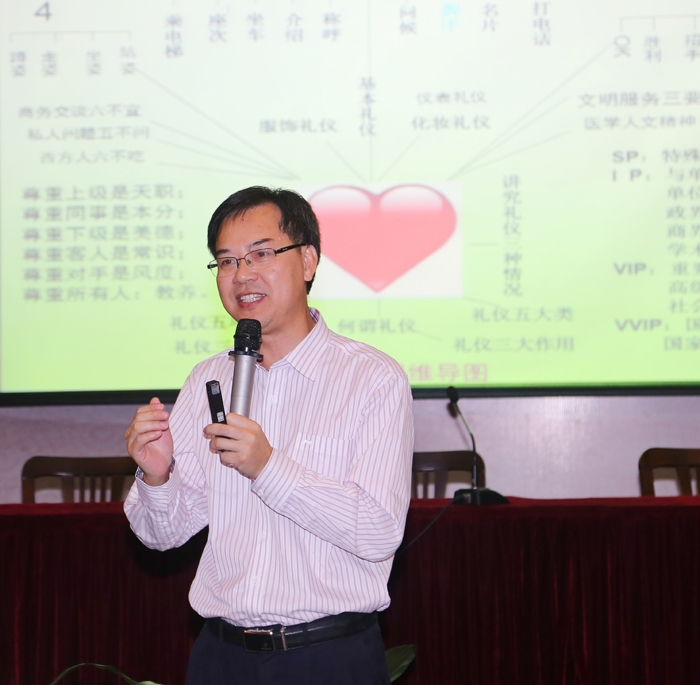 ??? 10月6日晚上,我院特邀杭州品佳管理咨詢中心培訓師、浙江工商大學MBA導師王照品教授作“醫(yī)院服務(wù)理念與服務(wù)禮儀”專題講座。醫(yī)院全體行政、后勤工作人員及臨床、醫(yī)技科室的醫(yī)護人員共400人參加了培訓會。