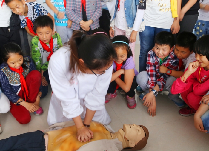 ?? “咦,護(hù)士姐姐,我這樣按壓對不對”、“護(hù)士姐姐,我這力氣夠大了嗎”“醫(yī)生叔叔,我打電話120該怎么說呀”……在新華小學(xué)五樓技能實(shí)驗(yàn)室里同學(xué)們爭先恐后地提出各種問題。