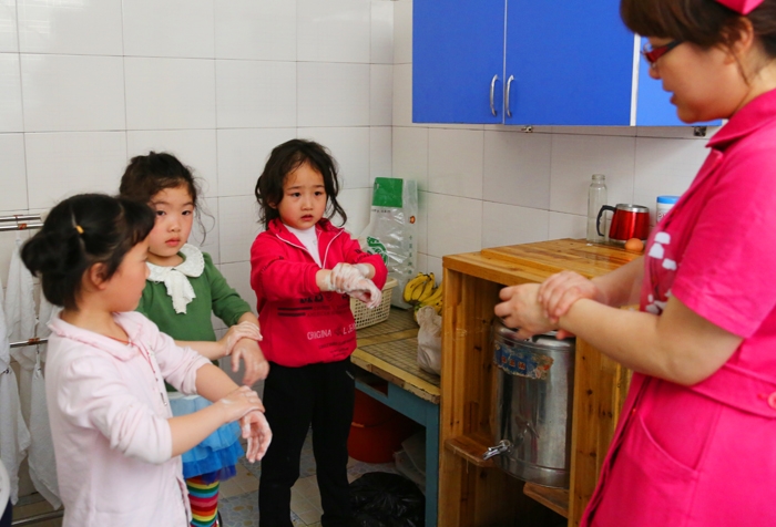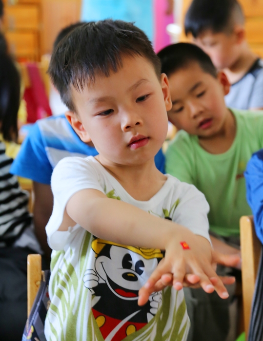 ??? 志愿者們還一對一的給孩子們進行“六步洗手法”的示范演練,鞏固了六步洗手法的要領(lǐng),教他們學做“健康十指操”:“掌心相對,手指并攏,搓搓搓;手心對手背,十指交叉,搓搓搓……”孩子們邊念步驟邊練習,很快就掌握了六步洗手法。