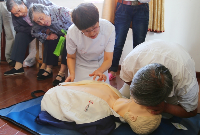 ??? 活動當(dāng)天醫(yī)護人員利用自己的專業(yè)特長免費為50余名老人測量了血糖和血壓,進行了體檢,并向他們現(xiàn)場示范指導(dǎo)心肺復(fù)蘇的方法和應(yīng)急處理措施,發(fā)送健康教育知識手冊100余份,耐心解答居民咨詢的健康問題。根據(jù)老年人年齡大易導(dǎo)致誤用藥、亂用藥等特點,為老人解讀藥物的正確保存方法,高血壓的保健知識及藥物使用注意事項,吸入劑的使用方法,女性特殊時期用藥注意事項。大家細(xì)致耐心的服務(wù)受到了居民們一致好評。