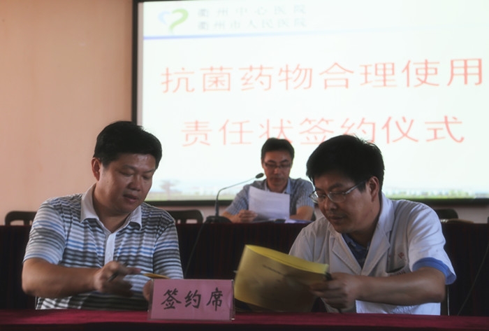 ??? 簽約儀式由院黨委書記徐天才主持,院長陳震宏與臨床科室代表:外科片、內(nèi)科片、重癥醫(yī)學科、普外科責任人簽定《衢州市人民醫(yī)院抗菌藥物合理使用責任狀》。