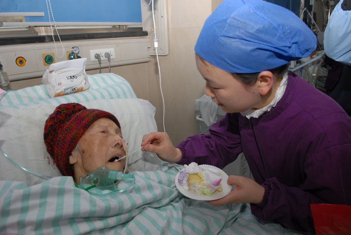 12月21日下午,我院EICU病房里情誼濃濃,該病房的醫(yī)護(hù)人員給90歲的住院病人周文貞送上了蛋糕和鮮花,為老人過了一個特別的90大壽。