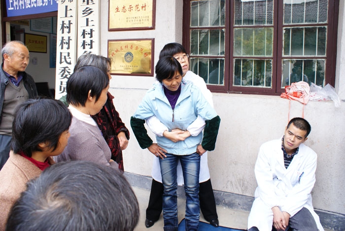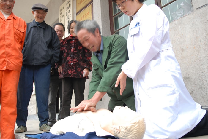 上村村位于衢州西北部,距城區(qū)33公里,海拔650米。村里以留守老人和小孩居多。經(jīng)過了50分鐘的跋涉,醫(yī)務(wù)人員到達(dá)了該村,當(dāng)?shù)氐拇迕褚呀?jīng)擺好了義診的桌子。測血壓、疾病咨詢、健康宣教,聞訊趕來的村民一下子將村委大院擠滿了。當(dāng)急診科邵微穎護(hù)士長將帶去的醫(yī)學(xué)人體模型擺開,向村民們講解心肺復(fù)蘇操作的時候,現(xiàn)場頓時安靜了下來,大家認(rèn)真聽著邵護(hù)士長的講解,隨后依次在模型上練習(xí)心肺復(fù)蘇操作。村民們一板一眼的練習(xí)著,邵護(hù)士長也在一邊熱情的指導(dǎo)著。