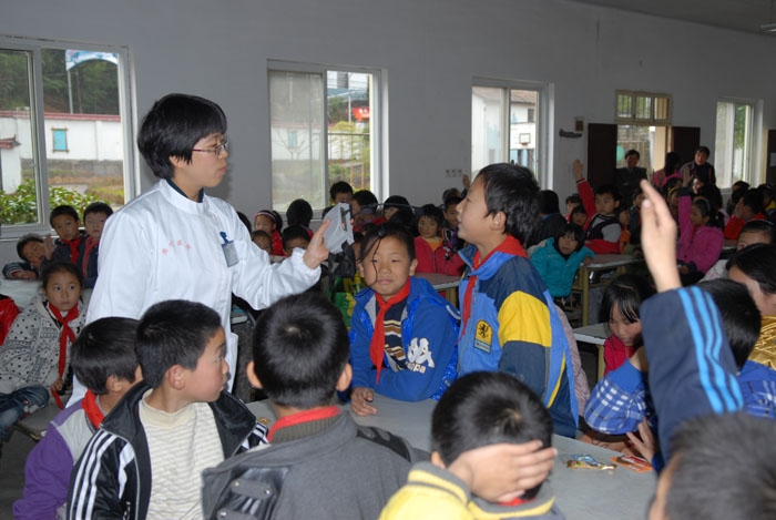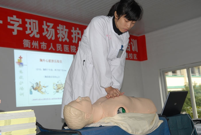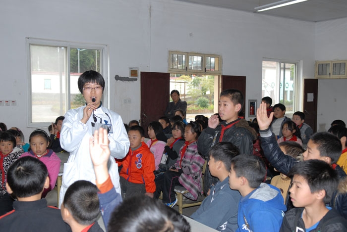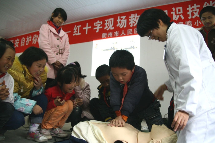 下午1點,邵微穎一行又來到柯城區(qū)鹿鳴小學(xué)七里校區(qū),花了2個小時時間為該校近200名師生上了一節(jié)內(nèi)容豐富的防范意外的急救知識課。講者生動,聽者認(rèn)真。山區(qū)孩子的淳樸和好學(xué)也深深感動了我們的醫(yī)護(hù)人員?!拔襾?、我來”,他們積極舉手發(fā)言,邵護(hù)士長為他們回答正確的小獎品更是調(diào)動了他們的學(xué)習(xí)熱情。孩子們爭相在人體模型上操作,并把邵護(hù)士長指出的不足記在了本子上······