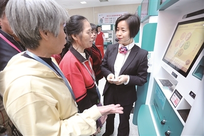 昨日下午,20名衢報傳媒市民觀察團(tuán)成員走進(jìn)衢州市人民醫(yī)院、衢州市中醫(yī)醫(yī)院、衢州市婦幼保健院等三家市本級公立醫(yī)院,感受“最多跑一次”改革以來醫(yī)療衛(wèi)生服務(wù)領(lǐng)域的新變化。圖為工作人員向觀察團(tuán)成員介紹新型自助一體機(jī),市民可通過該機(jī)器自助完成門診掛號、化驗單打印等業(yè)務(wù)。