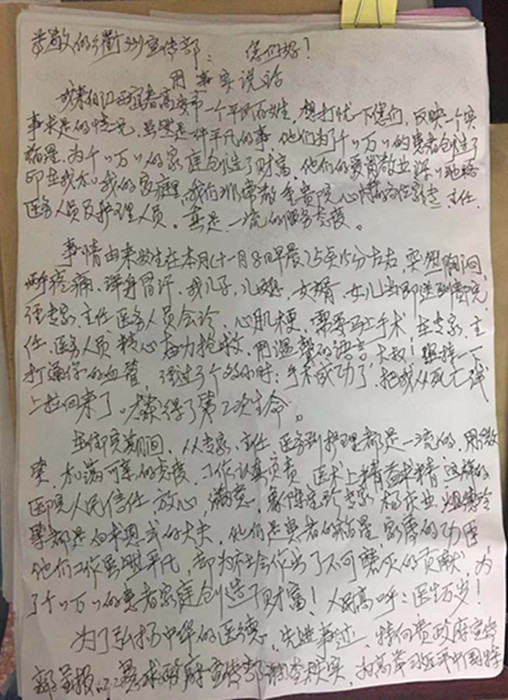 經(jīng)過兩周的精心治療和悉心護(hù)理,沈先生的病情穩(wěn)定,為了表達(dá)謝意,他寫下了這封感謝信,親手交到了護(hù)士長張小芳手中。字里行間流露出患者及家屬對醫(yī)護(hù)人員的信任與感激,對我院心血管內(nèi)科醫(yī)護(hù)團(tuán)隊精湛的醫(yī)術(shù)以及優(yōu)質(zhì)服務(wù)的極大肯定,更表達(dá)了對衢州這座有禮的城市的贊美!