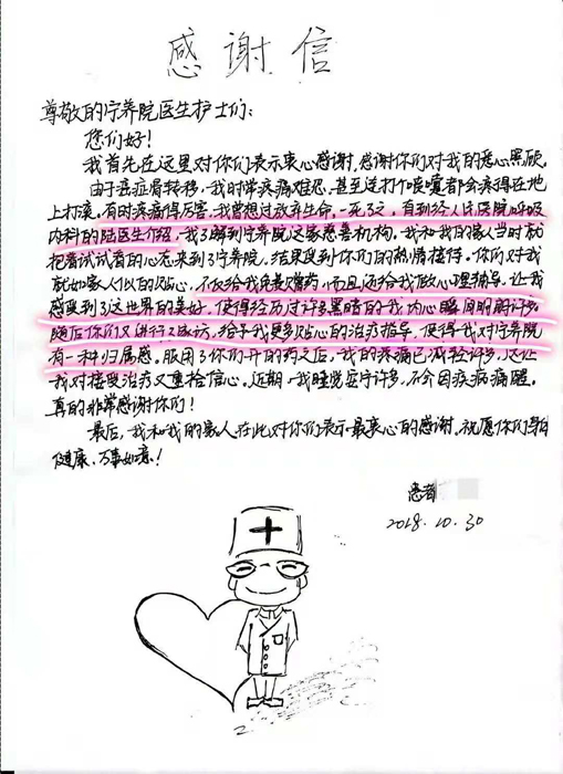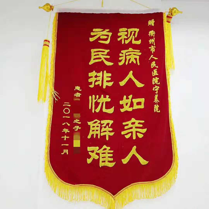 在為戴阿姨服務(wù)的102天的時(shí)間里,她從剛接受服務(wù)時(shí)只能躺在床上,到現(xiàn)在疼痛得以緩解,已經(jīng)可以自行翻身坐起,在輔助下能簡(jiǎn)單的步行。戴阿姨的兒子看著母親一步步地好轉(zhuǎn)到安詳離世,真心地感謝醫(yī)護(hù)人員的付出,于是親手制作了一面錦旗。