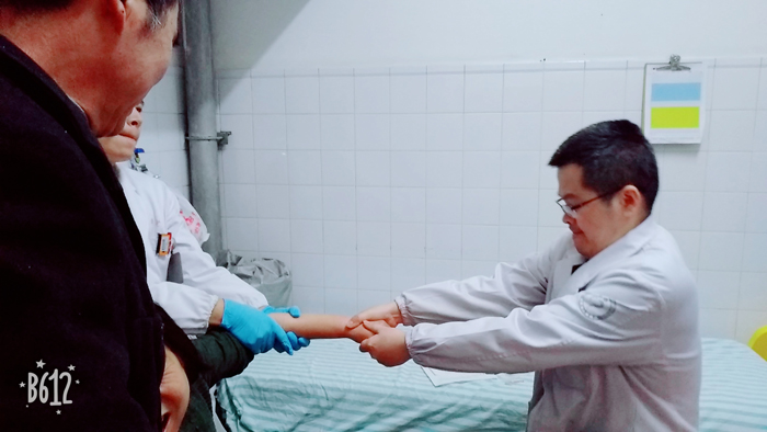 骨科醫(yī)生正在為脫臼的病人復(fù)位