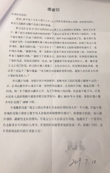 事后我才知道,金伯伯全名叫金勝橋,是衢州市人民醫(yī)院愛(ài)心服務(wù)中心的一員,自愛(ài)心服務(wù)中心成立以來(lái)一直堅(jiān)持做志愿者,無(wú)論刮風(fēng)下雨,他總是第個(gè)到崗,第一個(gè)開(kāi)始愛(ài)心服務(wù)工作,為了回答病人的問(wèn)題,他總是不恥下問(wèn),時(shí)常向醫(yī)務(wù)人員請(qǐng)教相關(guān)就診流程及醫(yī)學(xué)知識(shí),截止2019年6月底,金伯伯愛(ài)心服務(wù)時(shí)長(zhǎng)達(dá)到了1070小時(shí)。