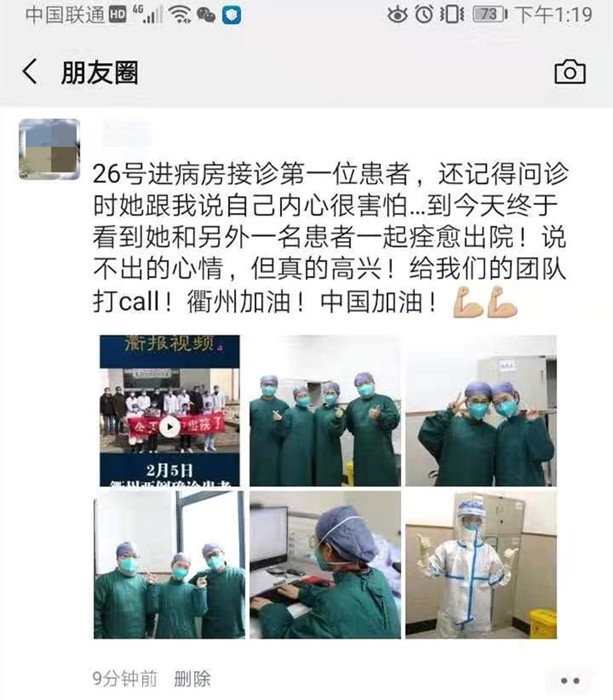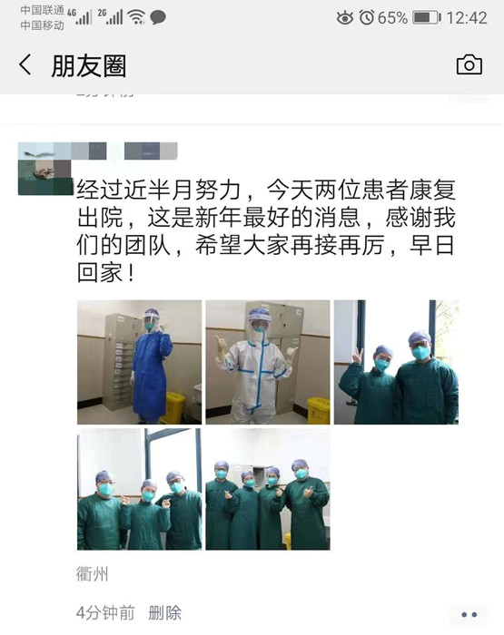 衢江區(qū)的胡女士是第一例轉(zhuǎn)入我院救治的重型確診病例。1月23日,胡女士從武漢返回衢江,因頭痛、咽喉疼痛到當?shù)匦l(wèi)生院就診, 1月25日,經(jīng)市級醫(yī)療專家組會診,確定為新型冠狀病毒感染的肺炎重型病例,1月26日,轉(zhuǎn)入我院。經(jīng)過11天的隔離治療后出院。