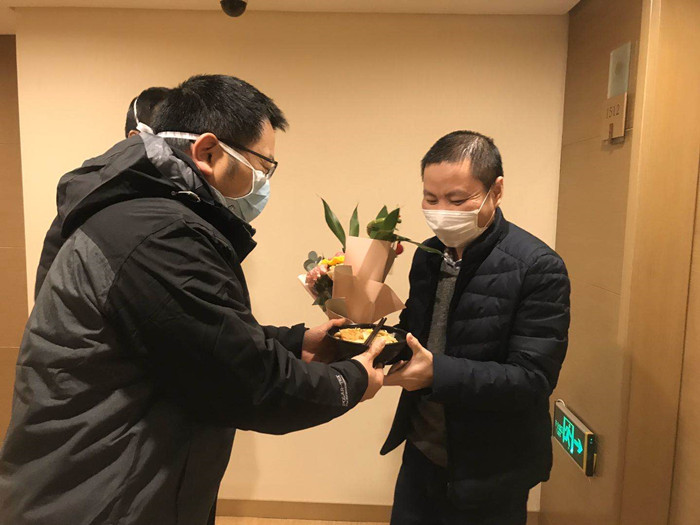 2月1日那天,我正在酒店房間,突然酒店門鈴響起,我很疑惑,打開門的一瞬間,省衛(wèi)健委曹啟峰副主任、徐飛鴻處長捧著一碗長壽面和一束鮮花站在門口,笑著對我說:“小華,生日快樂?。⒔舆^長壽面、捧著鮮花,那一刻,內(nèi)心很溫暖。