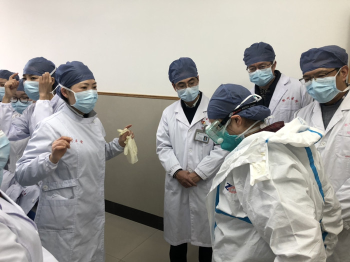 沈紅艷(左一)為醫(yī)護人員做院感防護指導(dǎo)