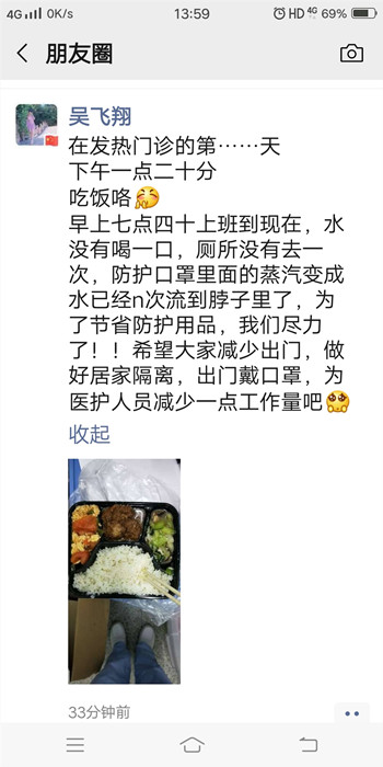 詢問病史、測(cè)量體溫、造冊(cè)登記……這些在平??磥碓倨胀ú贿^的工作,此時(shí),因?yàn)橐咔槎鴱?qiáng)度倍增,從早上7:40持續(xù)工作到下午1:20,整整忙碌了近5個(gè)小時(shí)才吃上午飯,期間,沒時(shí)間喝水、沒時(shí)間上洗手間,防護(hù)口罩里的水蒸氣凝結(jié)成水滴,N次流到脖子里也顧不上換, 短短10分鐘的午飯時(shí)間,之后,又馬上投入工作。