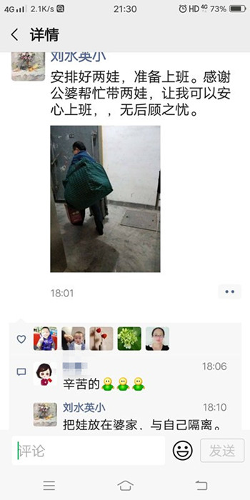 劉水英,發(fā)熱門診常駐護(hù)士,看到這個(gè)背影,有點(diǎn)心酸。照片上背行李的是劉水英的丈夫,為了妻子能安心工作,無后顧之憂,他把孩子的行囊背到爺爺奶奶家。